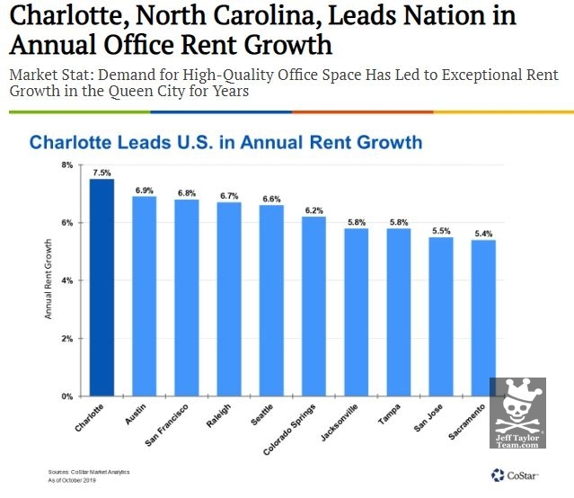 Charlotte now leads the nation in annual office rent growth as the North Carolina city has become one of the most in-demand office markets in the nation.
